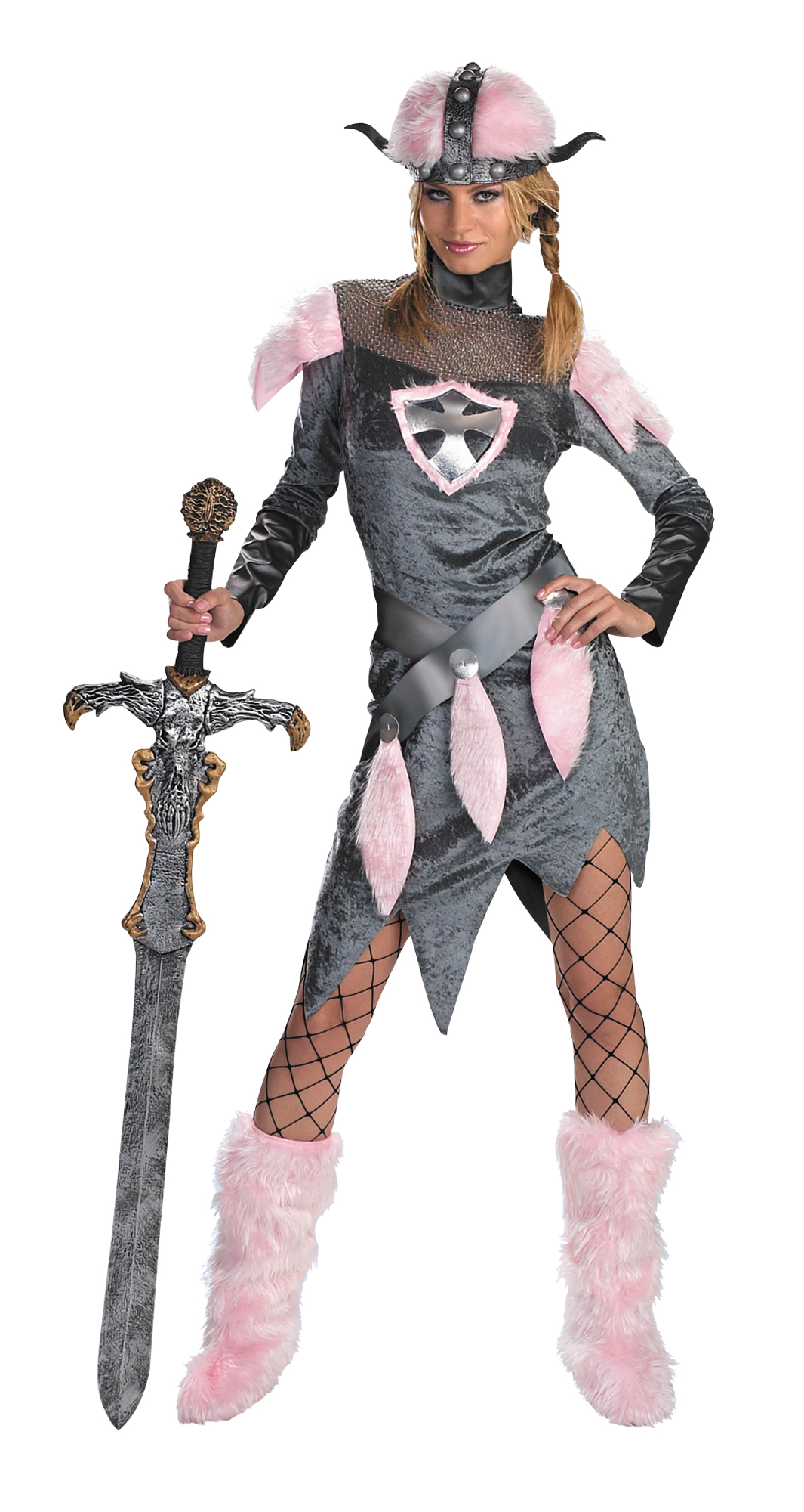 Dress, faux fur boot covers, belt with matching faux fur pelts attached and soft vinyl helmet. Adult sizes 12-14. Fence net pantyhose and sword not included. Polyester.