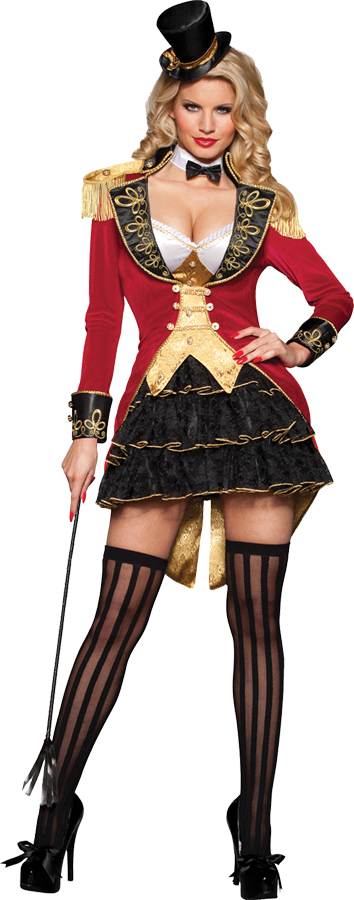 Be the cutest ring mistress ever in this quality costume! Deluxe sassy dress with golden brocade faux vest and black lace ruffle tiered skirt with golden trims comes with a red velvety jacket with epaulettes and black lapels and cuffs with gold trim. Also includes a white collar with black bow tie accent and matching black petite top hat with a gold band. Packaged in a full-length zippered garment bag. From the Costume Confidential collection! Riding crop and striped thigh highs not included. Small fits sizes 4-6.