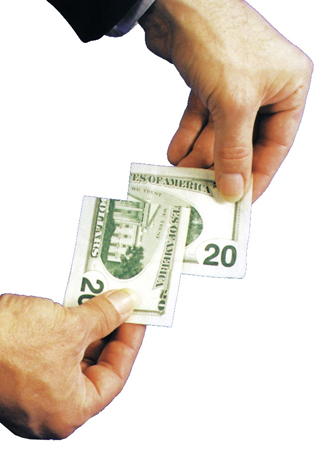 A one and a five dollar bill are folded to interlock. Impossible but bills visibly penetrate one another. Complete with sample stage money.