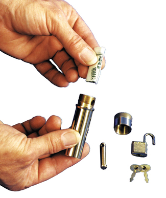 A performer borrows a dollar bill which initialed by spectator, and serial number noted. Bill is now folded, secured with a rubber band and placed within the folds of a hank, held by spectator. Performer now displays a small brass tube with threaded lid and brass tube running thru it. This is given to the spectator to hold in his free hand. Performer now snatches hank from spectator’s hand and the hank proves to be empty. The dollar bill vanished, later to be found in a sealed tube.
