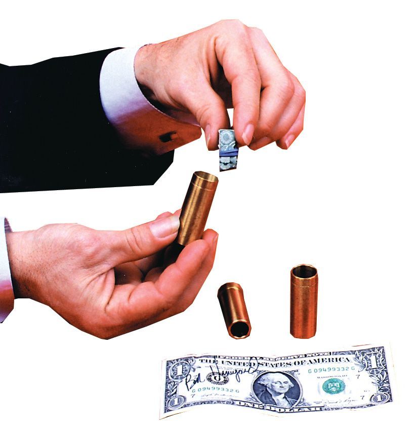 A spectator is asked to sign a dollar bill and place to within a brass tube. He remains possession of the tube throughout the effect. Magician never touches the tube once the bill is sealed. Upon spectator opening the tube, he finds that the bill has vanished. It is immediately found within our bill tube.