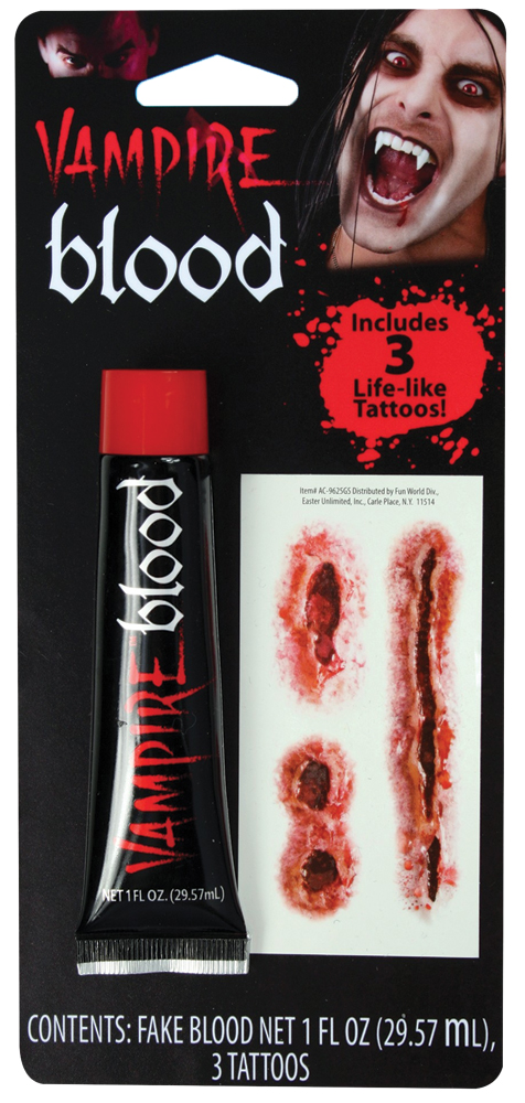 Kit includes a 1 oz. tube of liquid Vampire Blood and 3 realistc-looking tattoos to use along with it! Just what you need for your next gory character.