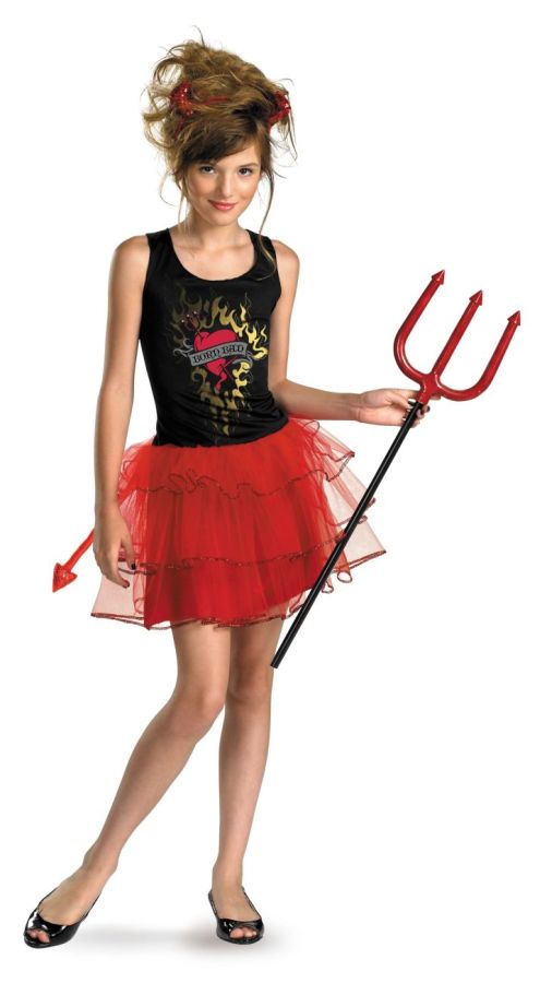 This Cute version of the classic devil costume features dress with black top and red tulle skirt, headpiece and detachable tail. Toy weapon not included. Child X-Large, fits girls size 14-16.