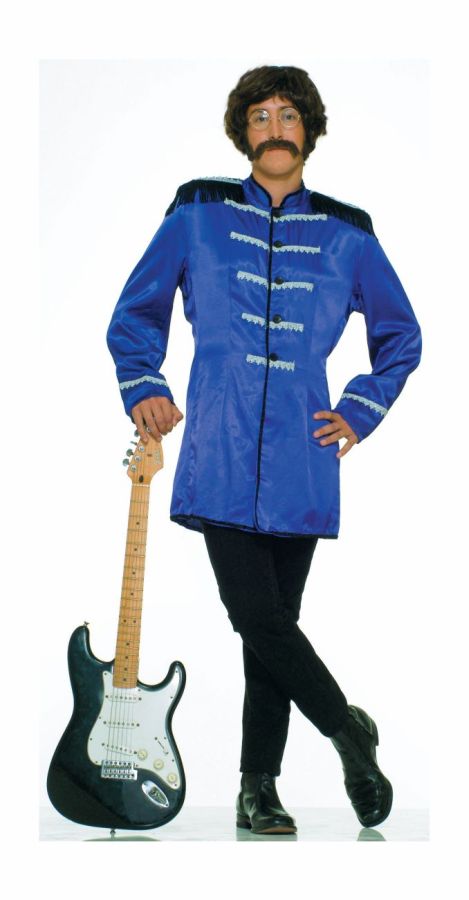 Nehru-collared thigh length jacket with black fringe epaulets has black trims and white braid on chest and sleeves. One size fits most.