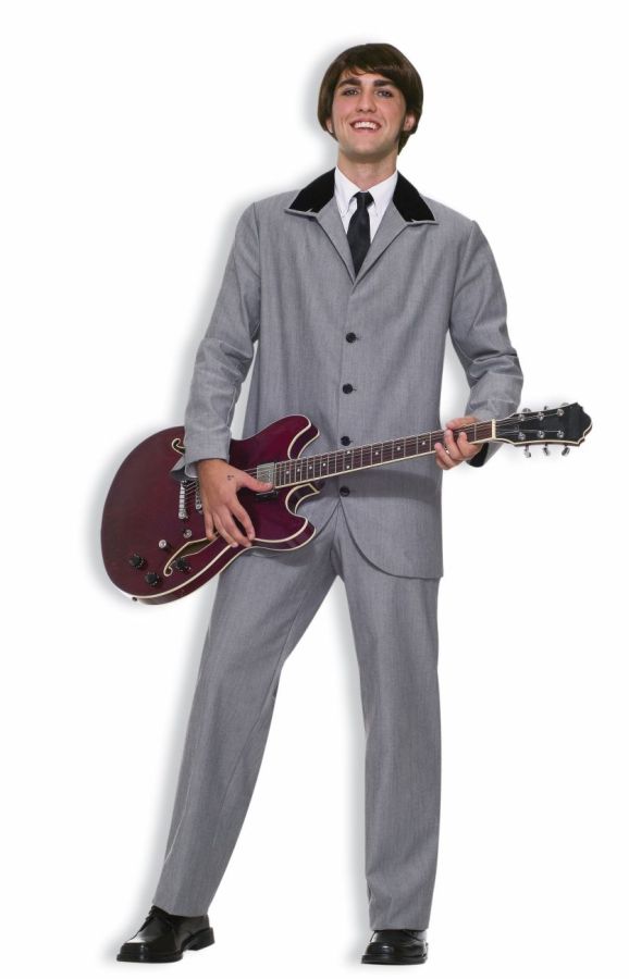 Grey jacket with black collar and matching pants. Add your own shirt and tie to complete the look. Adult standard.