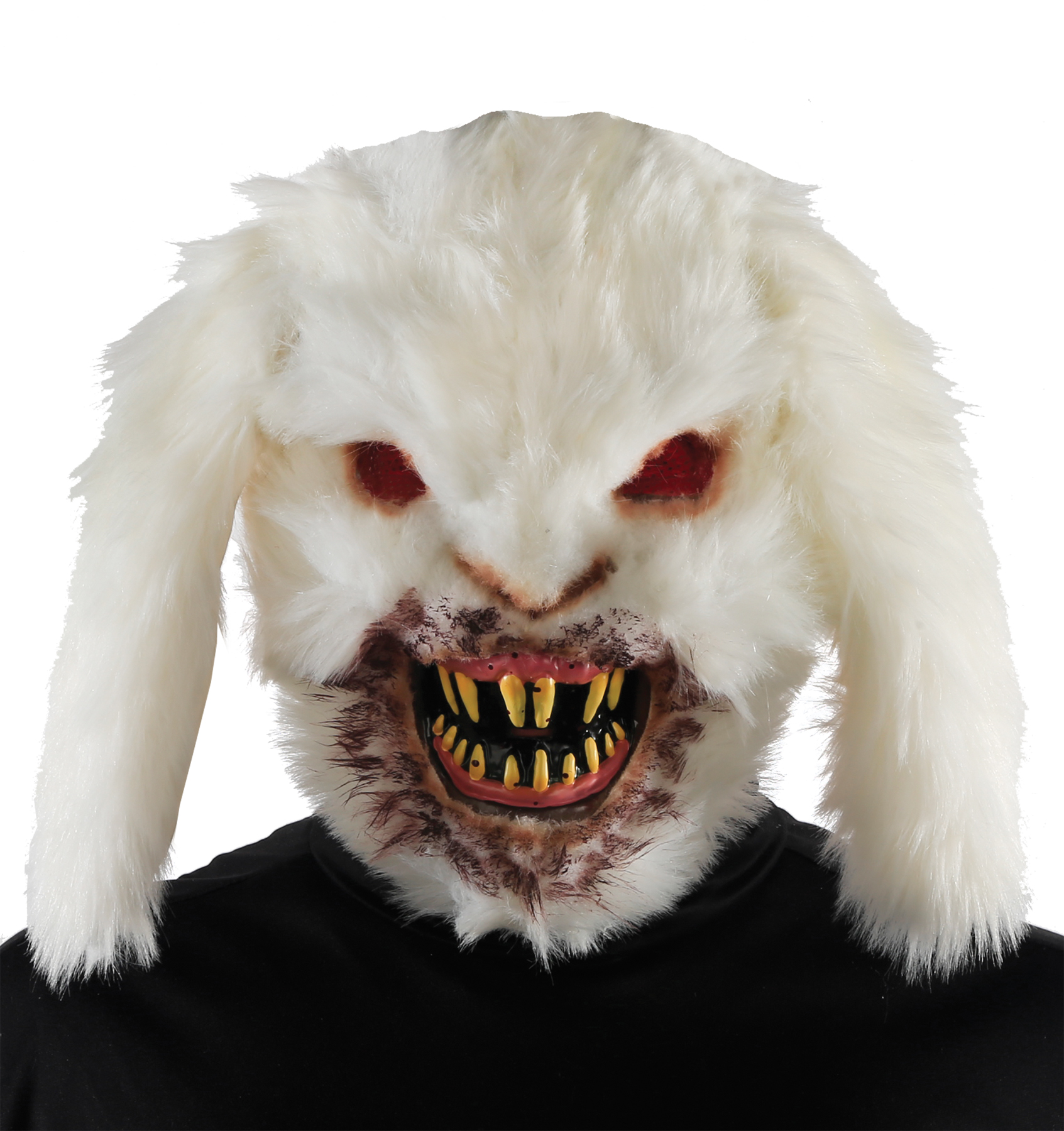 Scare the daylights out of everyone with this gruesome rabid bunny mask. This terrifying mask is made from vacuum-formed plastic, covered in white fur and features red mesh-fabric eyes, long yellow pointy teeth and mouth covered in the blood of his previous victim. Mask is held in place by an elastic strap that goes around the back of the head. Kids will never look at the Easter bunny the same again.