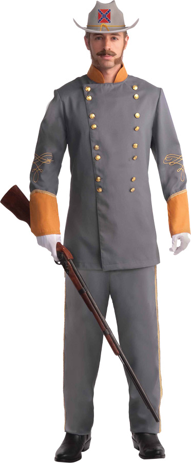 Perfect for civil war events and productions. Gray double breasted jacket has gold buttons, gold collar and cuffs, and includes matching pants. Standard fits up to size 42.
