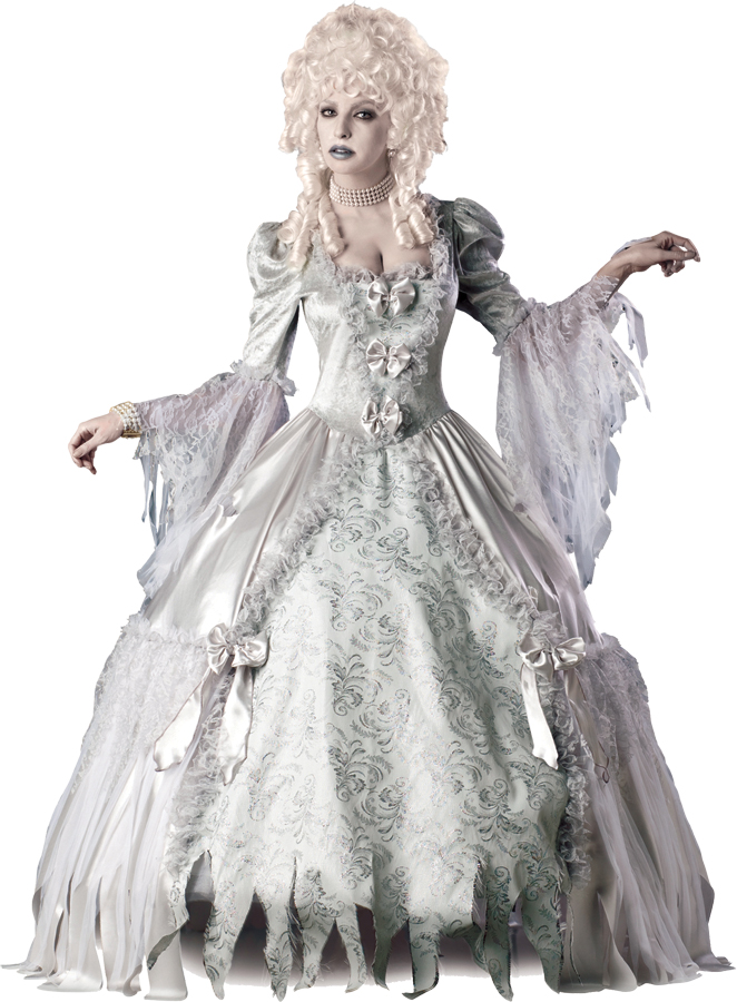 Full length gown with tattered lace and brocade fabrics and full structured petticoat. Wig, jewelry, and makeup not included.