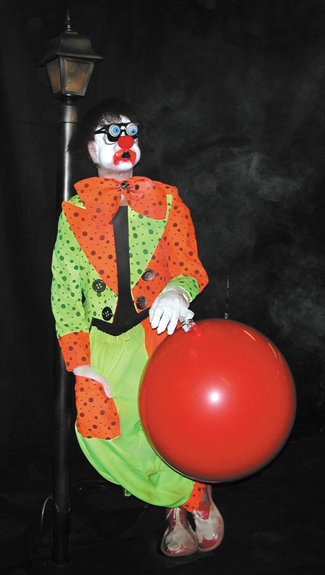 This Creepy Clown is casually leaning against a llamp post, the light flickering, then raises the balloon to his mouth and begins to blow the huge balloon up. When the balloon obscures his face, his head turns 180 degrees and suddenly, the Clown turns creepy. As the balloon is lowered guests are hit with a blast of air. Includes lamp-post with flickering light, costumed animated clown and an extra supply of balloons. Operated by included switch or with optional motion sensor, pressure pad or timer box. Clown faces shown in photo may vary. Requires AC power and a 100-125 psi air compressor (not included) Must ship by truck. Extra crating fee applies.