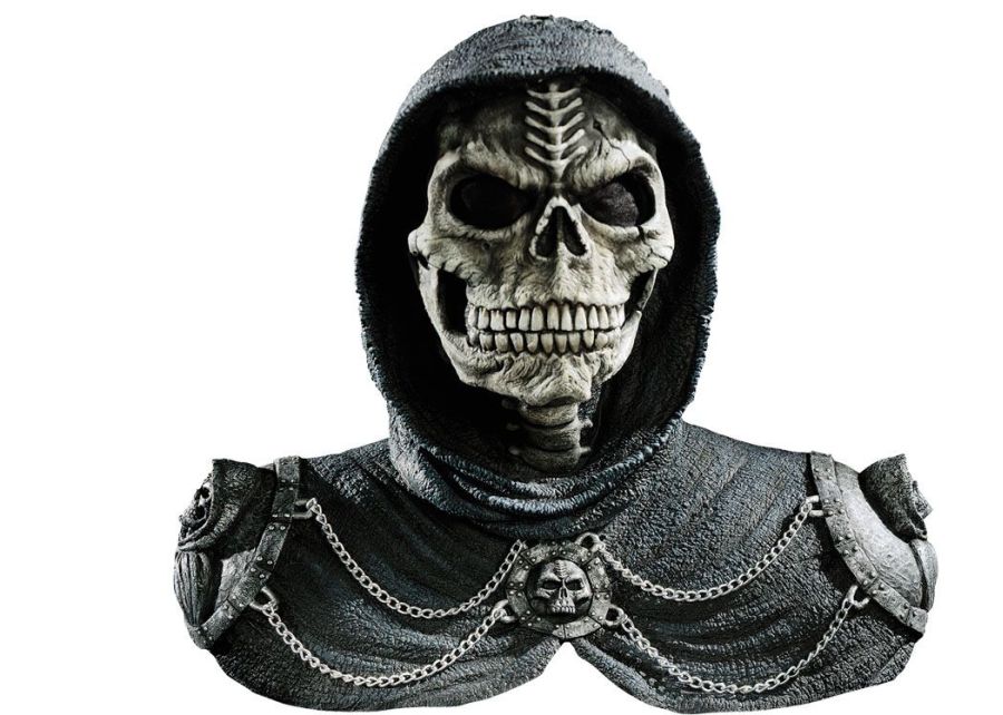 Nothing says dark reaper, than our Dark Reaper Mask and Shoulders set. This detailed mask and shoulder set features a mask with skeleton features with a cracked skull and pieces of the skull seen through hood of mask. Shoulder set has matching detailed skulls on shoulders and front of set, with silver chains connecting the skulls together. Full over the head latex mask and shoulder set. Mask 14 inches from head to shoulders, and 14 inches front of mask to back of mask. Shoulders measure 20.5 inches from shoulder to shoulder, and 9 inches from top of shoulder to bottom of shoulder piece.