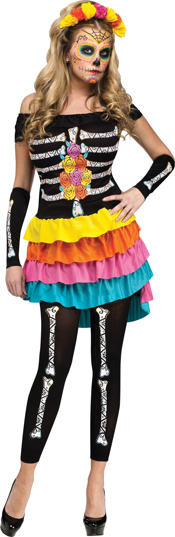 Colorful and fun! Dress has a black bodice with center flowers and rib bone print and a high/low hemline skirt with brightly colored layered ruffles. Also comes with black sleevelets with bone printing, footless tights with bone printing, and a colorful floral headband. Small/medium adult size fits sizes 2-8.