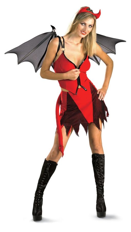 Includes low cut zipper front top, two-tone scallop bottom skirt with tail, wings and devil horn headpiece. Adult size Small (6-10). Polyester.