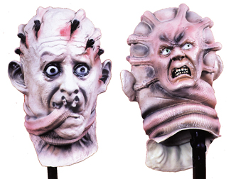 Unique mask has a face in front and back! Latex extended neck assures enough to tuck in to a shirt or robe. Measures approx 11 inches front nose to back nose, approx. 14 inches tall at tallest point, and approx. 9 inches from ear to ear straight through. Just a little larger than a regular mask.