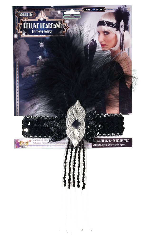 Traditional black and silver flapper headband with feather and beads design. One size fits most adults with sequin stretch headband.