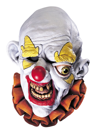 Disfigured clown face with red lips and nose, yellow eyebrows, and bulging eye. Full over-the-head latex mask.
