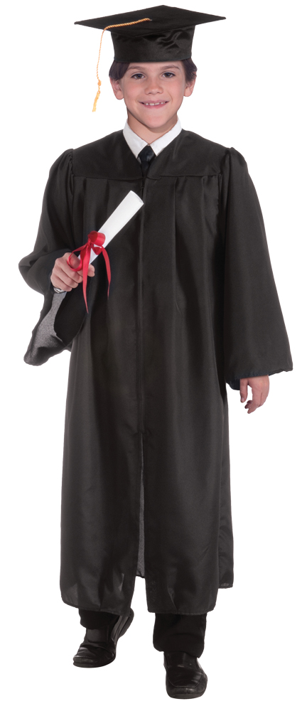 Useful for any graduation ceremony for a child. Black robe. Velcro closure. Fits sizes 7-10. Cap and diploma not included.