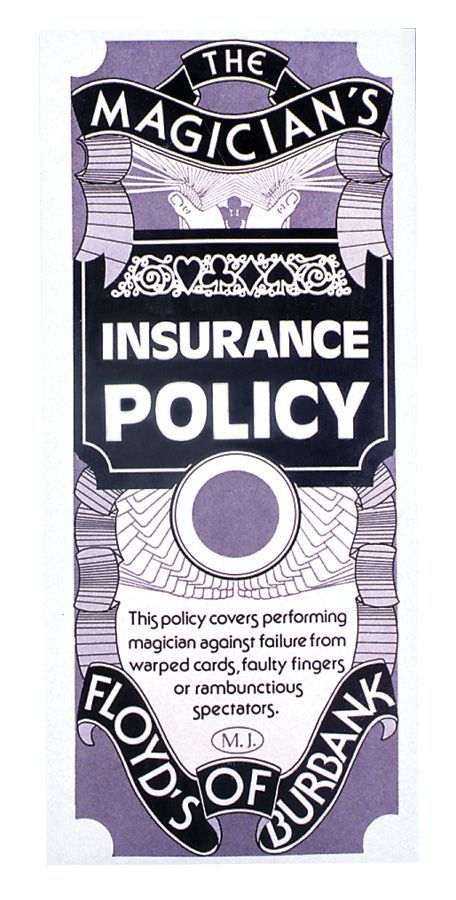 Volunteer picks a card. Magician has trouble finding the chosen card then points out that he has an insurance policy which opens and displays a gaint picture of the chosen card. Great comedy stage bit.