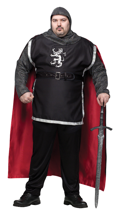 Dark tunic with silver trim, faux-chain mail sleeves, and dashing red attached cape comes with a belt and a matching faux-chain mail hood. Add your own pants and sword. One size fits most adults up to 6’2/300 lbs.