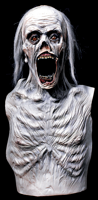 Mega monster mask! You just add hands and a robe to complete the costume! Corpse body with grave detailing. 28 inches tall from top of the head to the bottom of the bib and 17 inches wide. Chest bib measures 15 long.