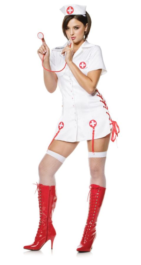 Button front dress, lace up sides with garter belt, head piece and stethoscope. Size medium 8-10