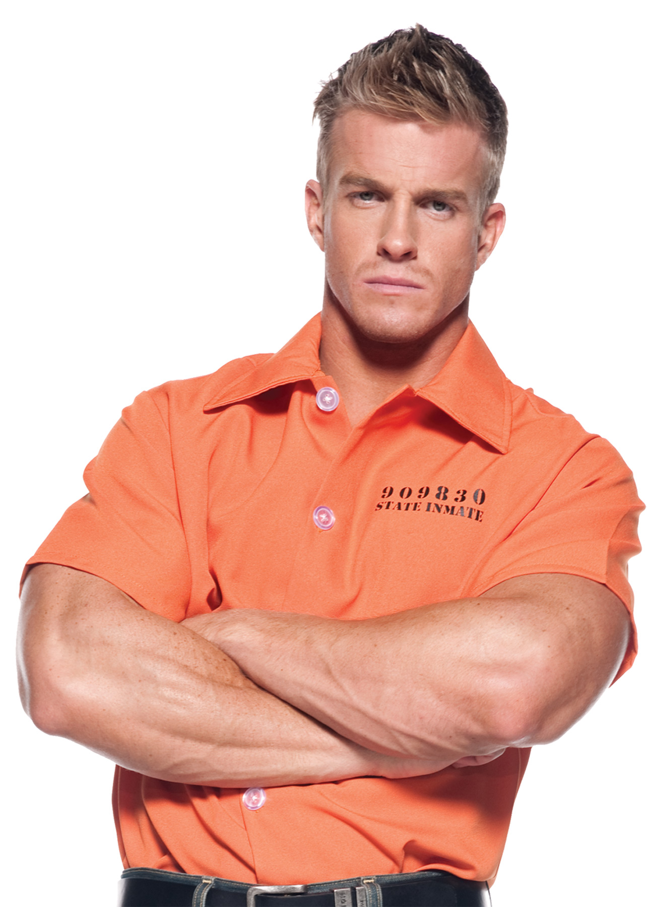 Bright orange shirt with inmate number printed right on the front. Just add your own jeans! One size fits most adults (42-46).