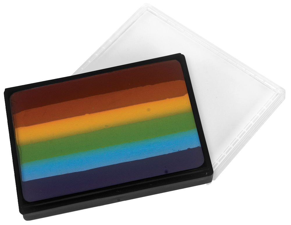 Mehron’s famous Paradise Makeup in new Prisma Blendset Palette. Semi-soft, water-activated moist Paradise AQ cake makeup in a ready-to-use striped configuration! Use Prisma blendsets to quickly paint rainbows, shadows, flowers, sky, or anything that requires multiple colors. Arc-En-Ciel has red, orange, yellow, light green, sky blue, and dark blue. 1.75oz