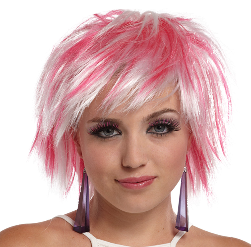 Cute pixie-style wig with white, pink and hot pink highlights. One size fits most adults.