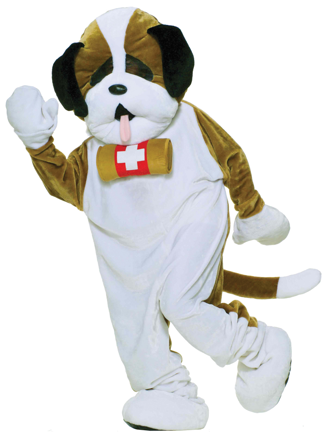 Plush puppy mascot includes head with see-through eye mesh, jumpsuit with attached mittens with hidden openings and foot covers. One size fits most.
