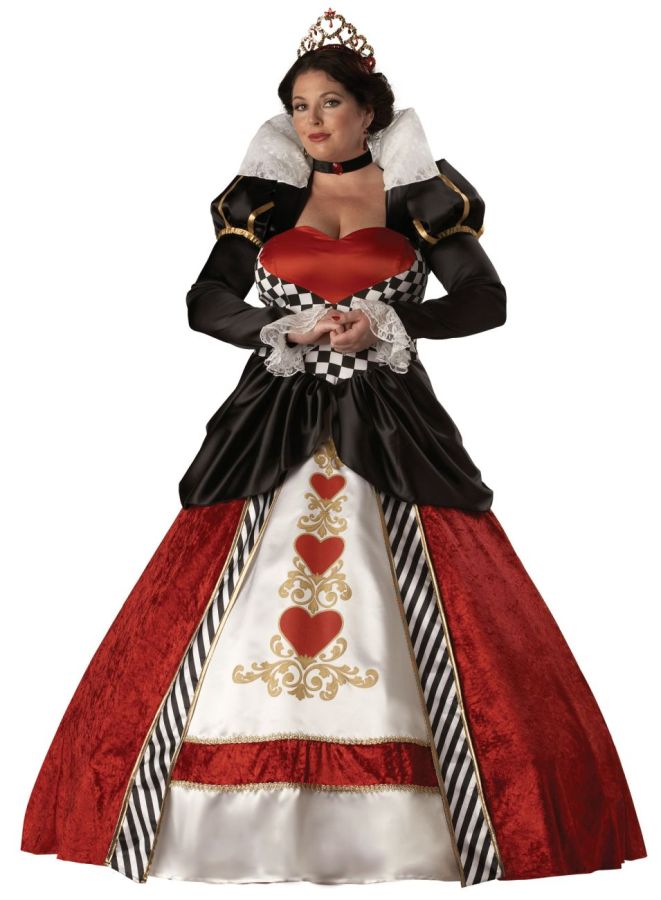 Full length gown with printed heart details and gold trim, hoop and tulle petticoat, velvet jeweled choker and sequin heart tiara. XXXL fits bust 48-51.5, waist 40.5-45, and hips 50.5-54. ADULT SIZE 24-26