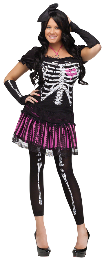 A cute, flirty skeleton costume perfect for the party! Includes dress, sleevelets, and bone print footless tights. Shoes not included. Fits adults small sizes 2-8.