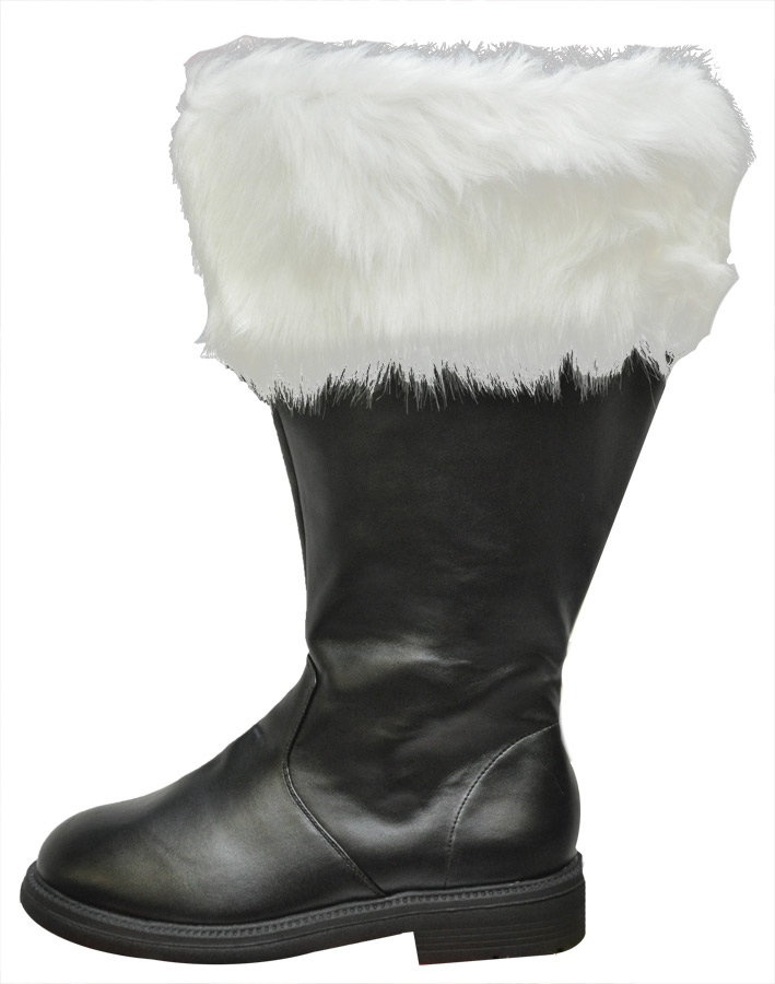 Faux-leather classic Santa Claus boot with deluxe white furry trim. Side zipper closure. Fits wide calves. Small fits shoe sizes 8-9. measures 22 inches in calf area.