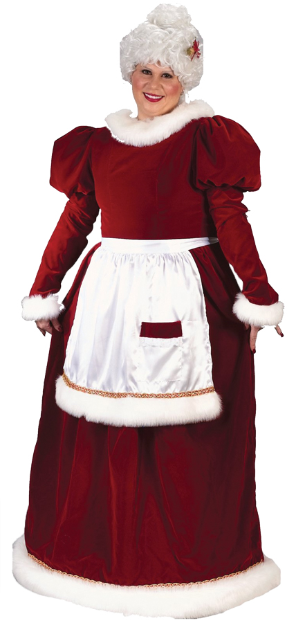 Long velvet dress trimmed in rich faux rabbit fur, satin apron with pocket brocade and faux rabbit fur trim. Adult Plus Size 16-24. Wig not included. Polyester, rayon, acrylic, nylon.