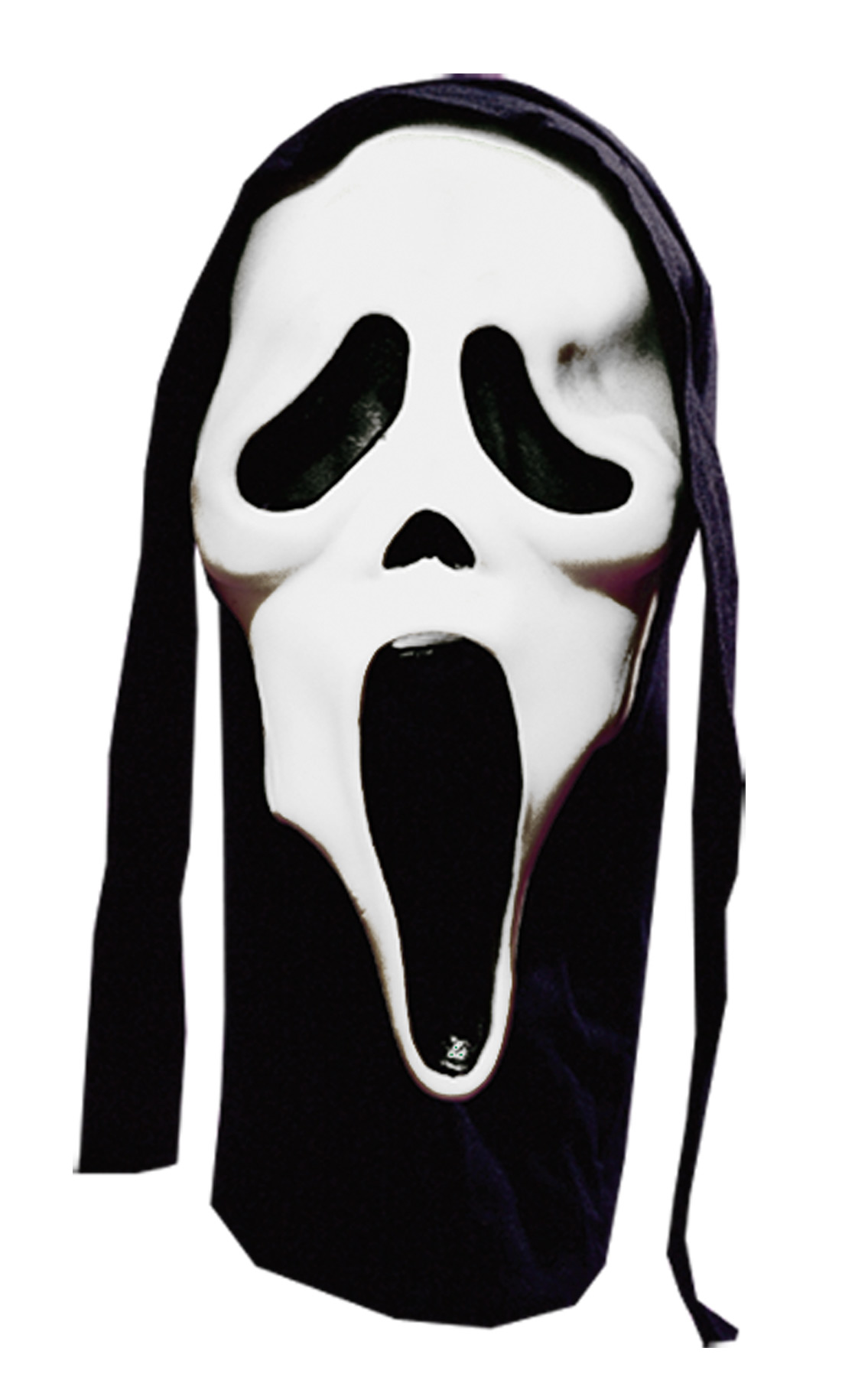 Slice and Dice. This face has a white face with black cloth hood attached. Seen in The movie Scream.