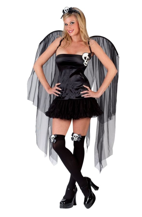 Mini halter dress with skull accent, gothic style wings, skull top thigh highs and matching headpiece. Size 2-8.