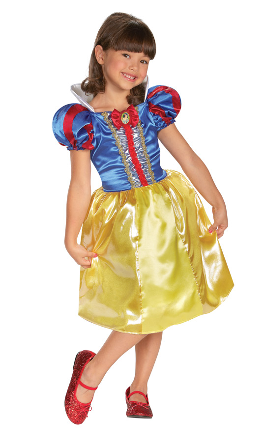 Dress your favorite princess up as one of Disney’s most popular movie characters, Snow White! Satin dress with familiar blue bodice, puff sleeves, and yellow skirt includes character cameo. Fits child sizes 7-8.