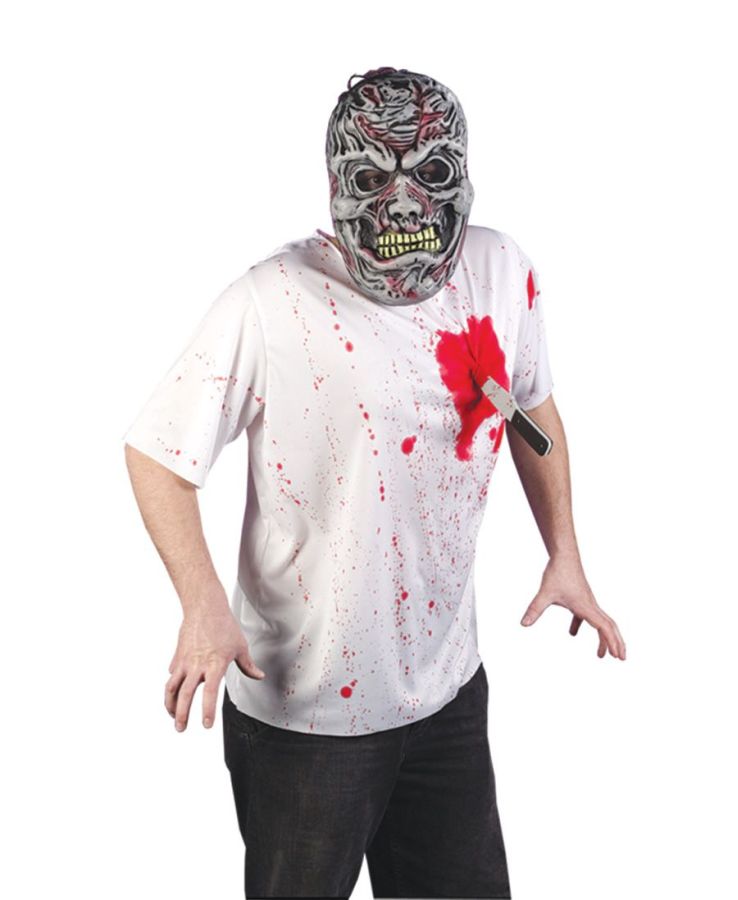 Blood stained t-shirt with plastic knife in heart attached with Velcro. Standard Adult size fits 140-200lbs. Mask is not included. Polyester and EVA.