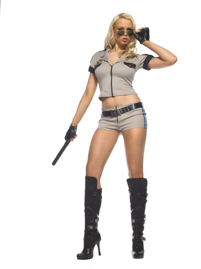 Low cut, short sleeve top, shorts, belt, glasses, gloves and baton. ADULT SIZE 10-14.