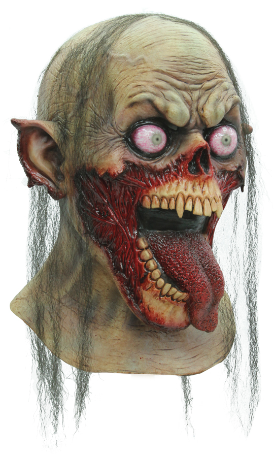Totally deranged, mouth agape with tongue hanging out. Full over-the-head latex mask. Individually hand painted for the most realistic look possible.
