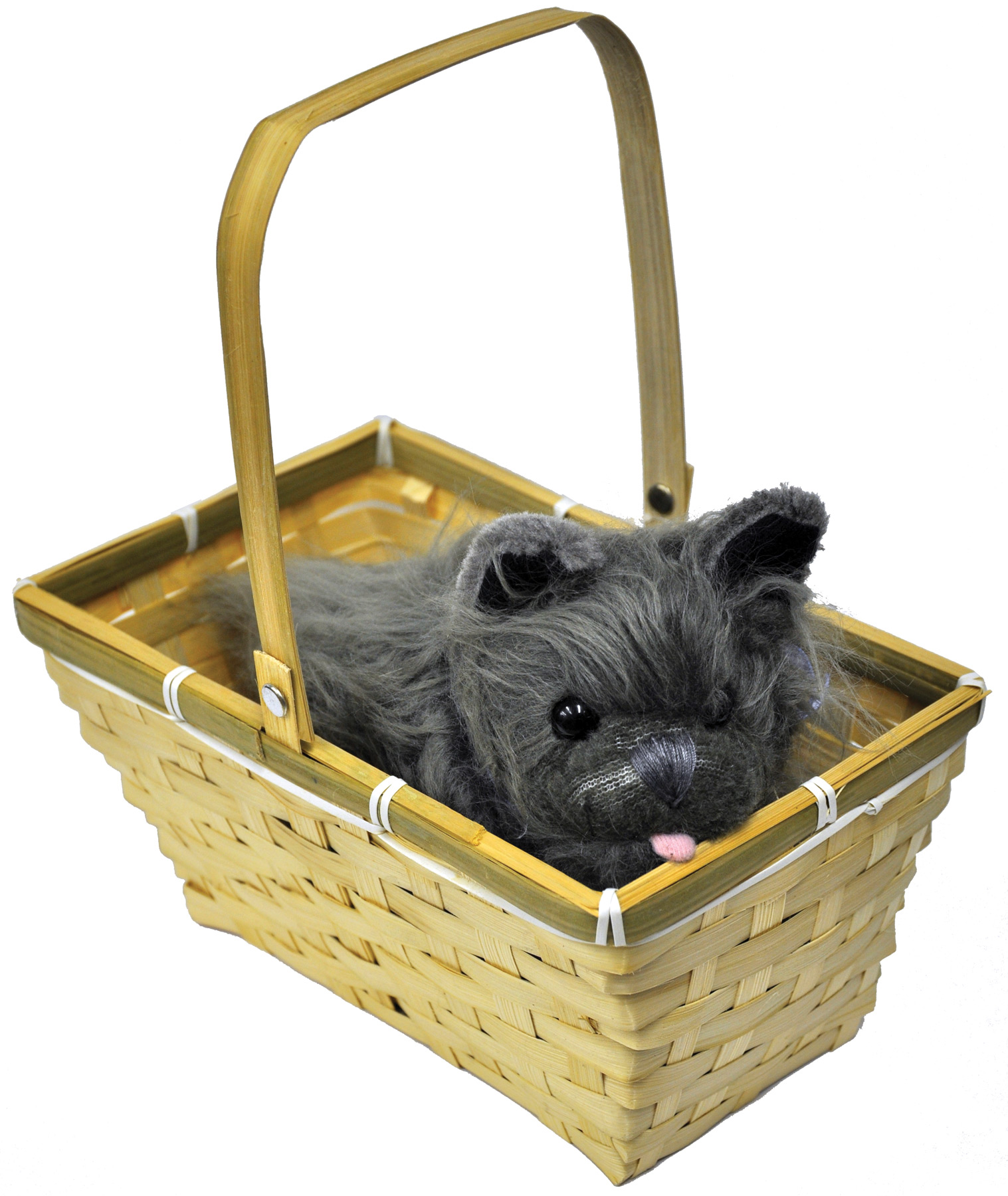 Lovely straw basket with adorable stuffed puppy included. Open basket is lidless and has a convenient handle for carrying on your arm. Measures 10 1/2 inches long, 6 inches wide, and 5 inches tall.