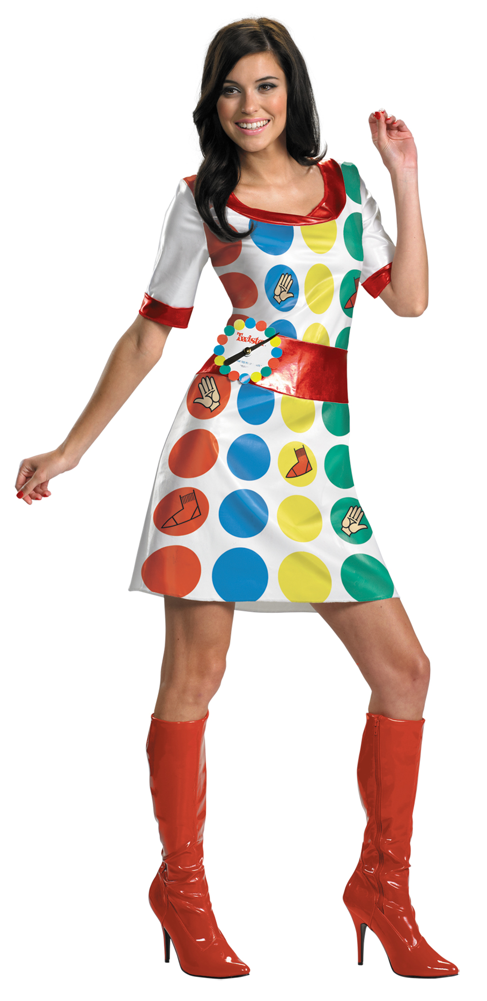 Dress with attached Twister spinner game piece. Adult medium 8-10. Boots not included.