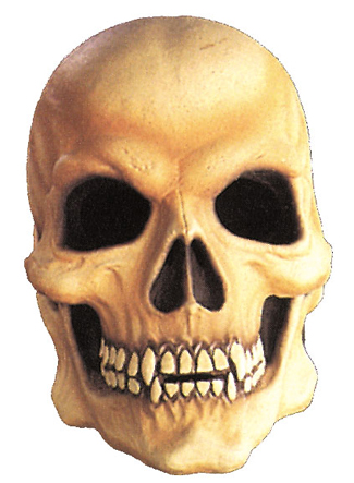 This is a full over-the-head mask that features detailed skeletal molding and painting. This product contains natural latex, and is not recommended for children under 10 years old. Vampire skull mask includes helpful hints to achieve desired fit, and care instructions for wear and storage. Mask has eye, nose, mouth, and ear openings for ventilation. This product measures 23 inches at base opening, and 12x8x8.