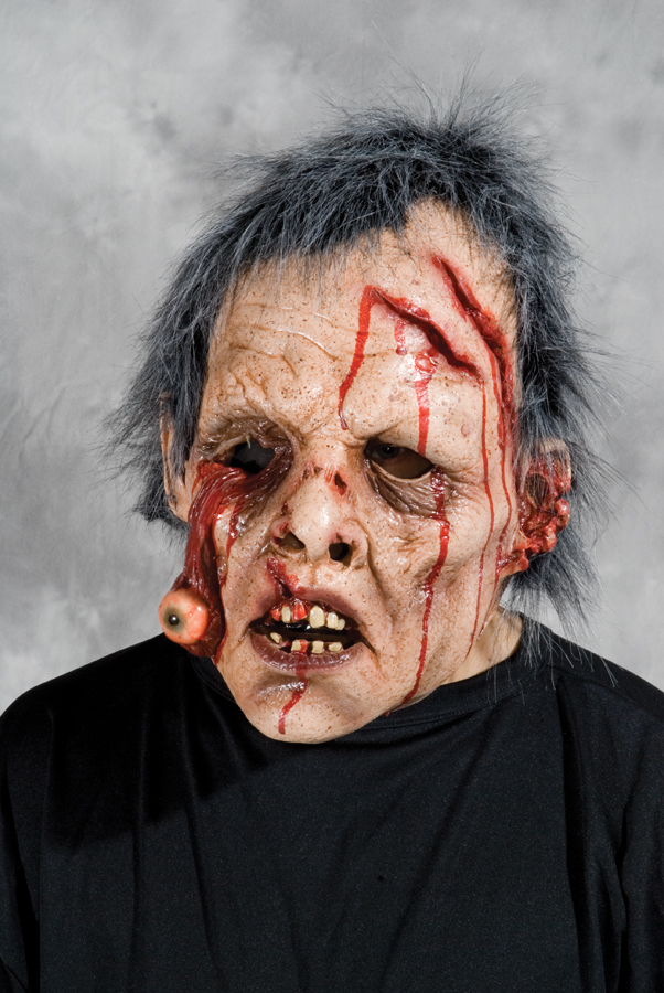 Bloody mask with right eye hanging out of socket. Latex mask with hair attached.