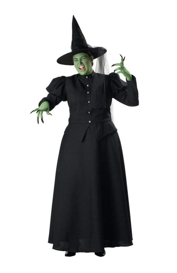 Full length black gown, tulle petticoat, hat with tulle sash and stick on black fingernails. Size (24-26). Buttons are nonfunctional. Measurements – Bust 44-47.5 inches, Waist 36-40 inches, and Hips 46.5-50 inches.