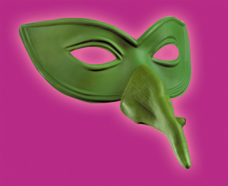 Green witch eye mask with attached long, pointed nose. Comes with elastic strap for easy wear.