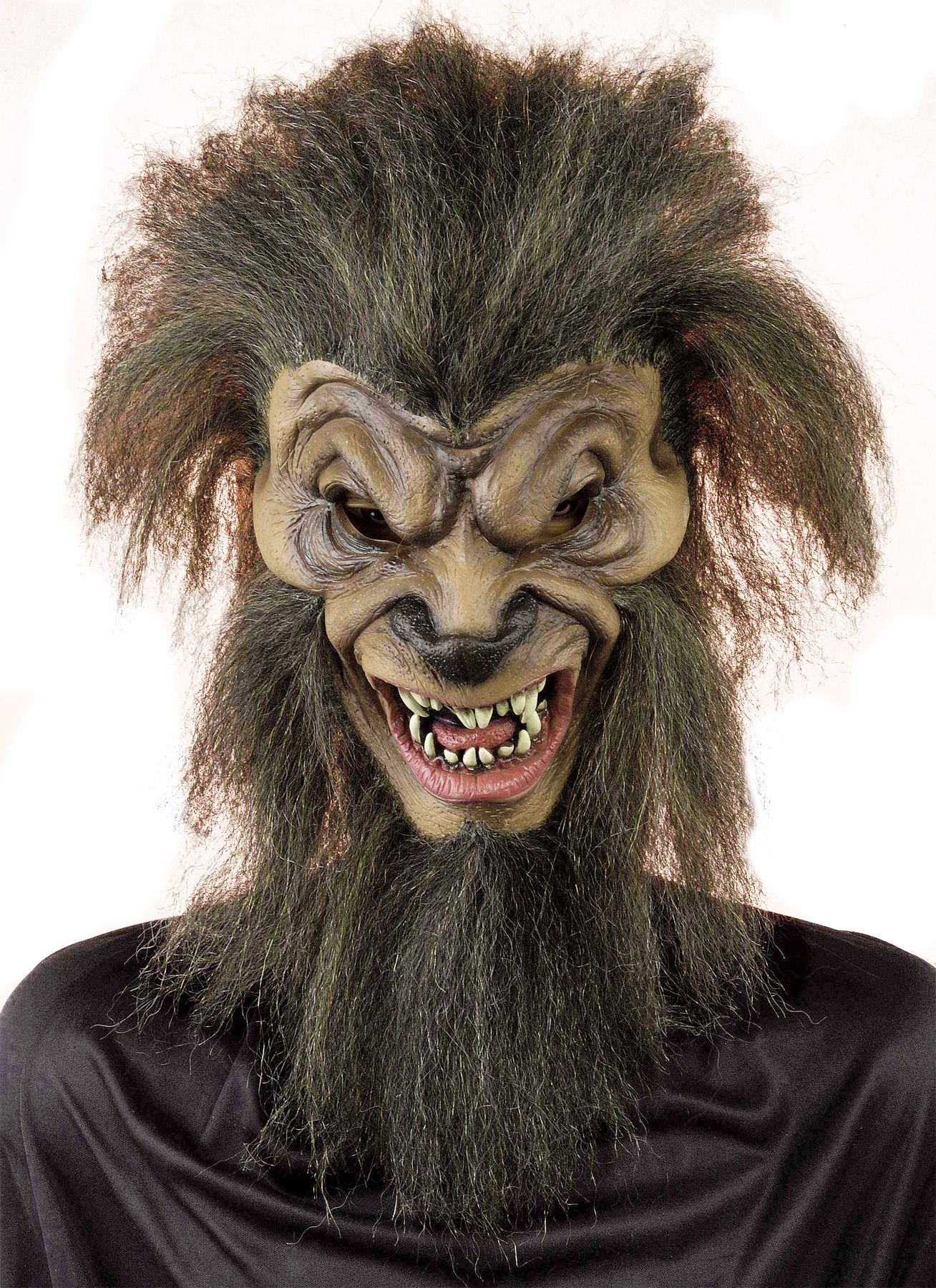 Latex full over-the-head mask that looks like a human turning into a wolf! Ragged hair and gnarly teeth add to the effect. One size fits most.