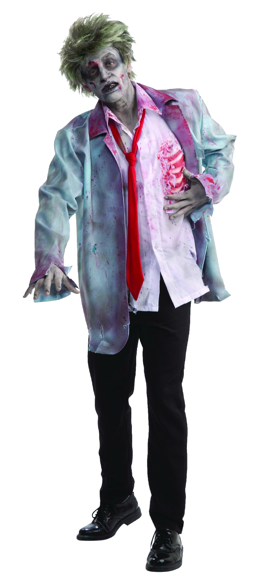 Goulishly clever costume comes with tattered suit jacket with attached bloody shirt front with exposed bloody ribs and a black necktie. One size fits most adults.