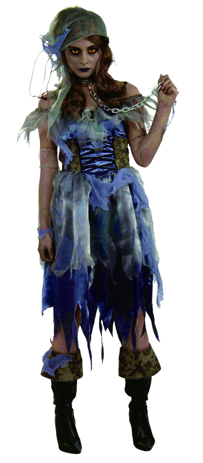 Nothing like pirate booty that’s also a zombie cutie! Features headpiece, dress, arm sleeves, neck chain and boot cuffs. Dress features that tattered look found so fashionable by the undead. One size fits most.